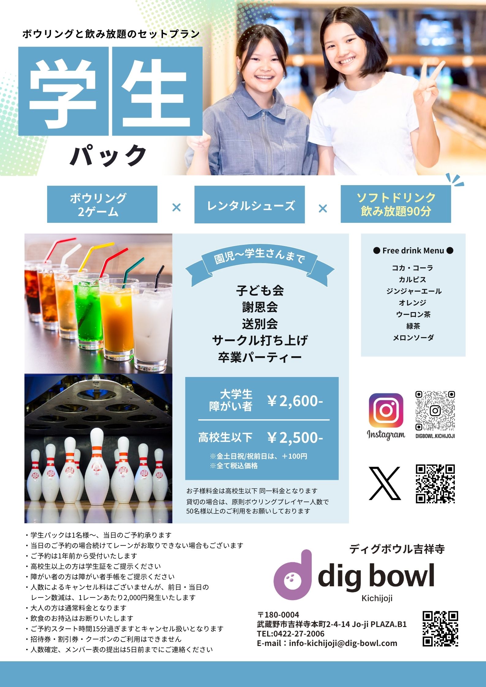 子ども会や送別会、謝恩会など、園児〜学⽣さんのご利用におトクなボウリングパックをご用意しました。ソフトドリンク飲み放題90分付き!
