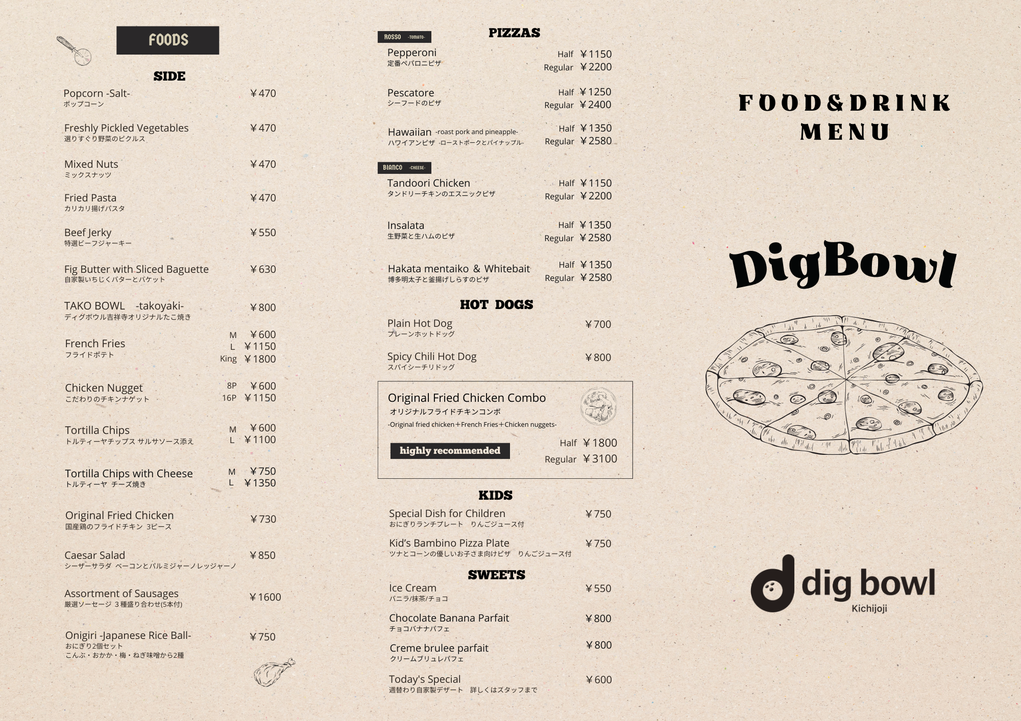 なんといってもメインディッシュのピザや、大人気フライドチキンコンボに注目!単品メニューだけでなく、コース料理やランチメニューなどもご用意。こちらのレストランはお食事けでもお越しいただけます。