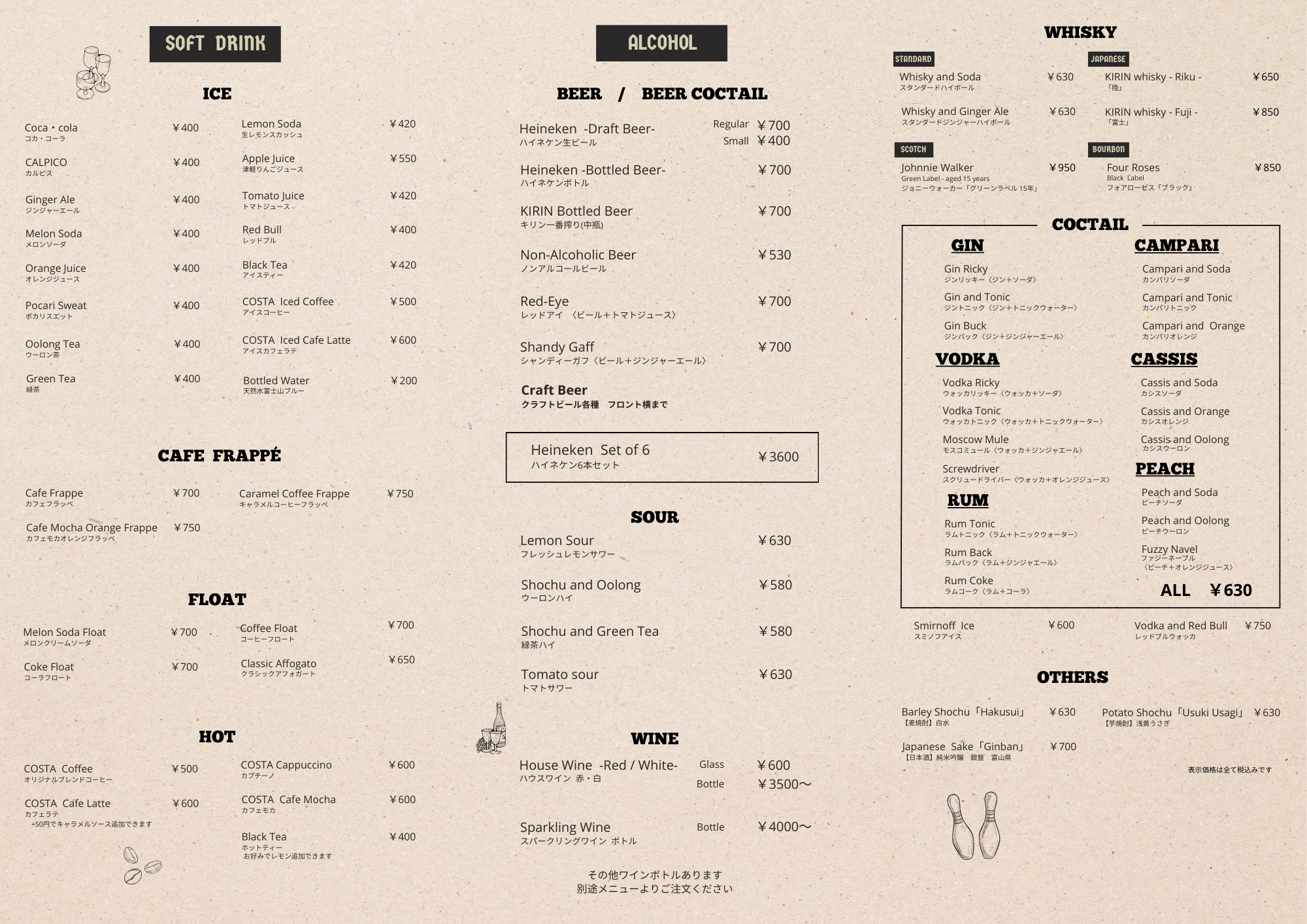 ビール好きにはたまらないハイネケンなど、ボウリングが楽しくなるアルコールも素敵にラインナップ。クラフトビール各種も揃えております。ワインや焼酎、ウイスキーに加え、スタンダードカクテルも24種も!もちろんソフトドリンクも多くとりそろええております。